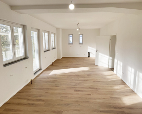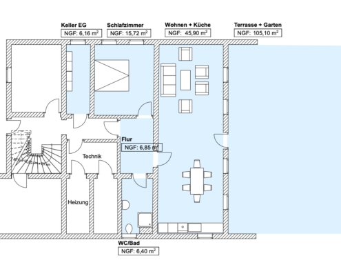Die Wohnung befindet sich in einem im Jahr 2025 umfassend kernsanierten und vollständig renovierten Gebäude. Die Erdgeschosswohnung wurde seniorengerecht gestaltet (nur eine kleine Stufe zur Terrasse). Das Badezimmer ist neu gefliest und mit einer Dusche ausgestattet. Das großzügige Wohn- und Esszimmer mit offener Küche bietet viel Raum zur individuellen Gestaltung. Neben dem Schlafzimmer steht außerdem ein Abstellraum zur Verfügung. Beheizt wird die Wohnung über eine Öl-Zentralheizung.